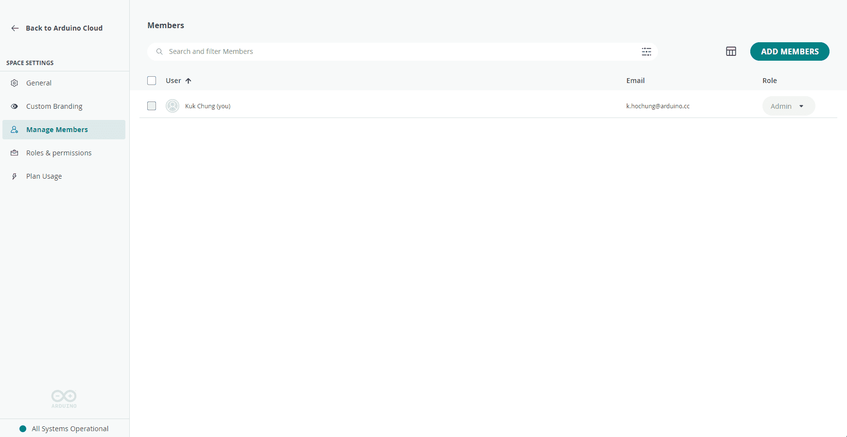 There are multiple role types in Arduino Cloud for Business to allow the admin to have full control of the rights/permissions each user has in the Shared Space. In this way, the admin can set up Role-Based-Access-Control (RBAC) by assigning profiles and sharing with any number of users.
