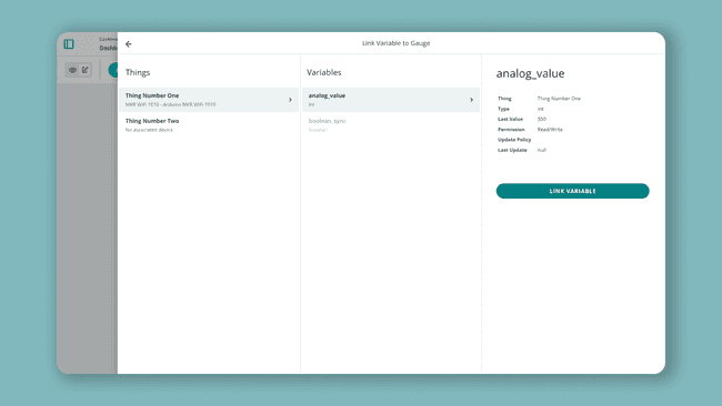 Now, let's link it to the analog_value variable, inside Thing Number One. Then click on the "Link Variable" button.